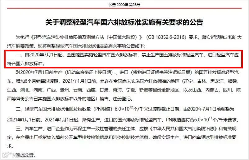 自2020年7月1日起,全国范围实施轻型汽车国六排放标准,禁止生产国五排放标准轻型汽车,进口轻型汽车应符合国六排放标准。