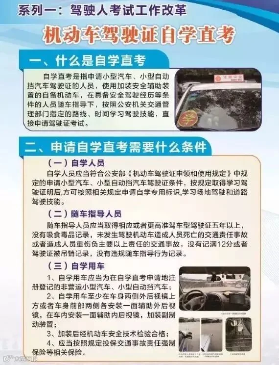 从1月1日起,天津、包头、长春、南京、宁波、马鞍山、福州、吉安、青岛、安阳、武汉、南宁、成都、黔东南、大理、宝鸡这16个城市将率先试行驾照自学新规。在学习驾驶的车辆、随车指导人员等条件均符合要求的情况下,学员可以在交管部门制定的路线和时间范围内自学驾驶技术,同时学员还要携带相关证明和警示标志,练习车辆则必须安装副刹车、辅助后视镜等装置。