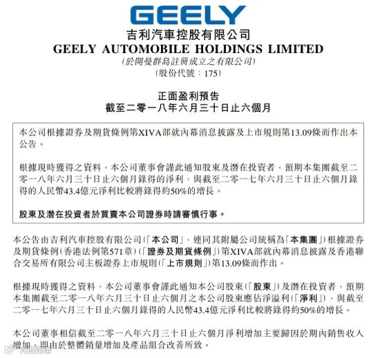7月11日,吉利汽车发布盈喜:截止2018年6月30日止,公司2018年上半年度净利润大幅增长,相比2017年上半年净利润增幅超50%。据了解,吉利汽车2017年上半年净利润为43.4亿元,由此推算,其2018年上半年净利润预计将超过65亿元。