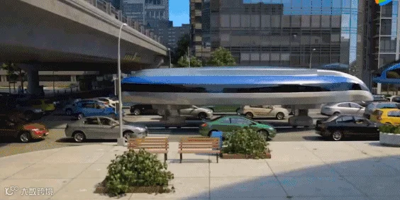 这种单轨“飞碟”为一种公共汽车,地面上的拥堵不会影响其出行。单轨回转架下面的支撑腿也是可以伸缩的,允许它们在通过相同的道路上时滑过上方或下方。