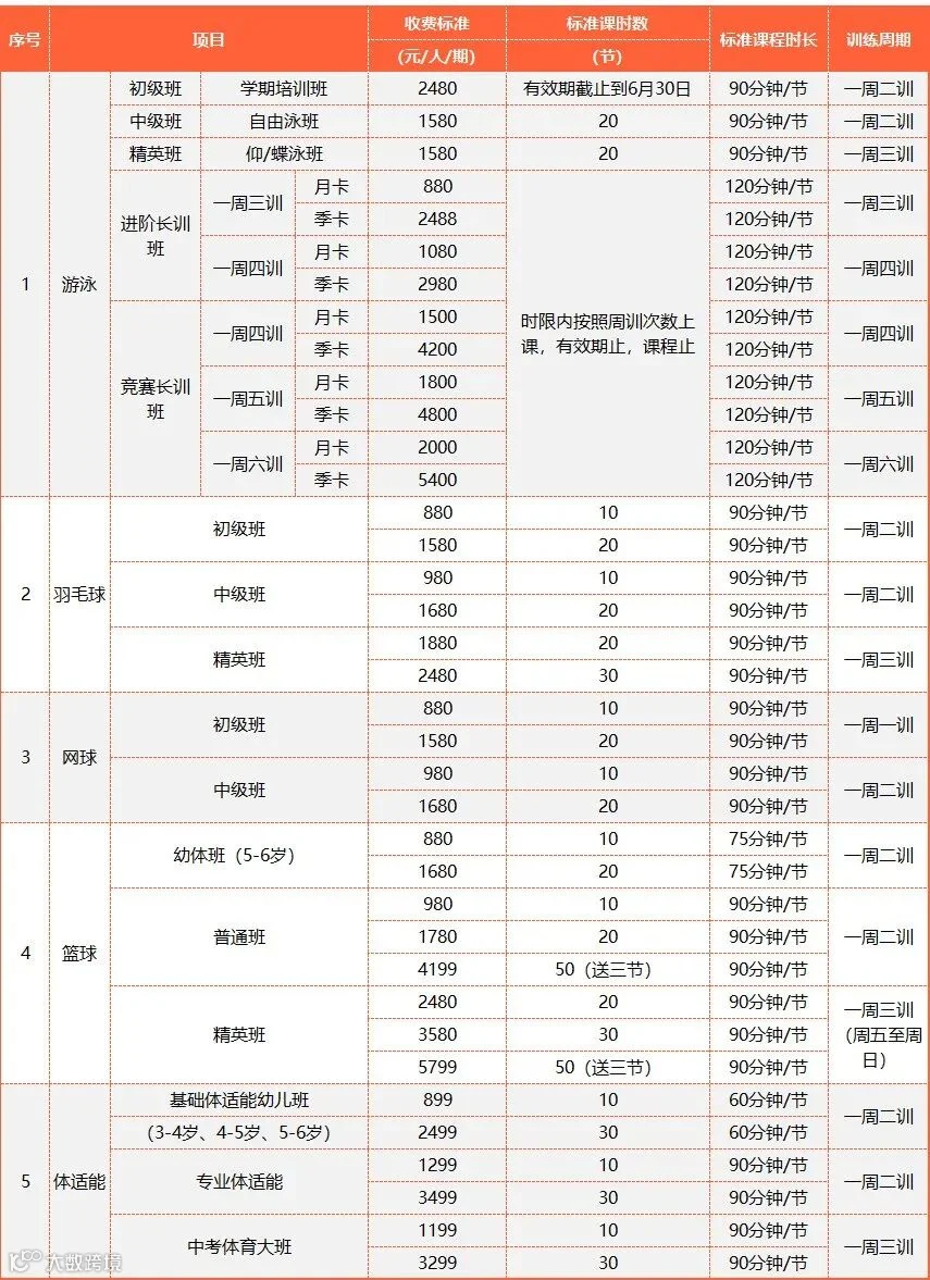 春季培训班收费标准