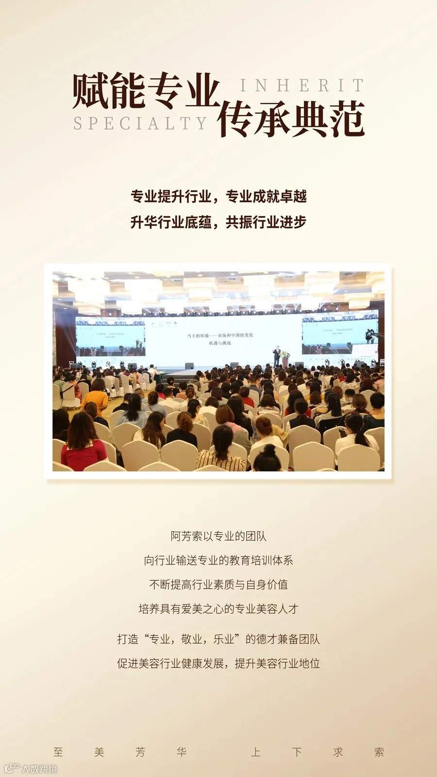 精锐团队深入全国百城千店,专业立美,无数美容天使、顾客因专业收获自尊、健康与美丽;薪火相承使命不息,阿芳索将继续创新,深化教育,升华行业底蕴,共振行业进步。