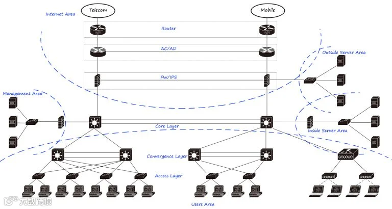 Internet出口区域使用路由器执行BGP和地址反转,使用IPS / anti-DDoS设备进行大流量泛洪攻击,使用流量控制执行出口负载,并使用防火墙进行安全隔离。安全管理区通过防火墙安全访问,通过审计、日志、入侵检测、网络管理等产品对整个网络进行管理。