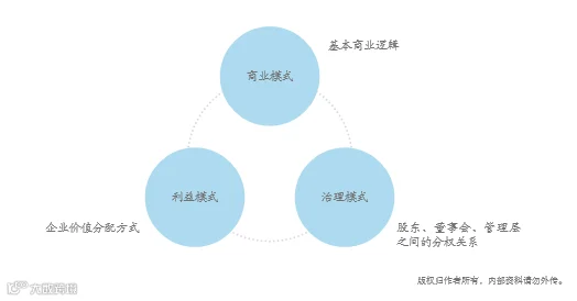 一般来说,企业的顶层设计包括商业模式、利益模式和治理模式。商业模式是企业的基本商业逻辑,利益模式指的是企业的价值分配方式,治理模式则是股东、董事会和管理层之间的分权制衡关系。如下图: