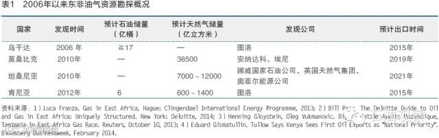 东非油气资源不仅分布广泛,储量也极为丰富。2013年全球发现的十个最大油气田中,有6个在非洲,其中4个就分布在东非。保守估计,东非地区油气总储量至少为650亿桶油当量。其中,乌干达石油日产量将达到20万~35万桶的水平,有望于2015年成为非洲第四大石油出口国;而肯尼亚、坦桑尼亚与莫桑比克近海海域的天然气储量可能超过尼日尔湾,成为世界第三大天然气出口区。
