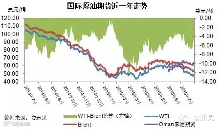 2015年7月WTI及布伦特原油期货双双直线下滑。7月份中国股市巨震、伊朗核谈达成最终协议、伊朗石油进入市场快于预期、期间美国原油库存继续走高、供应仍然充裕,国际油价进入熊市通道。