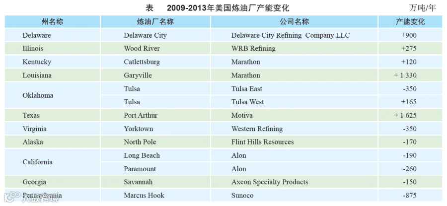 2000年美国汽油进口量约2 200万吨(主要来自:拉美33%、欧洲39%、加拿大18%,其余来自亚太、中东和前苏联地区);到2013年转为有进有出,其中出口约1 700万吨,99%流向拉美;进口约2 000万吨,主要来自欧洲、亚太和中东等地。2000年美国柴油进口约700万吨(主要来自:拉美28%、加拿大65%,其余是中东、非洲和前苏联);到2013年转为净出口,除从加拿大进口约400万吨外,出口量高达5 000万吨(其中拉美60%、欧洲40%)。