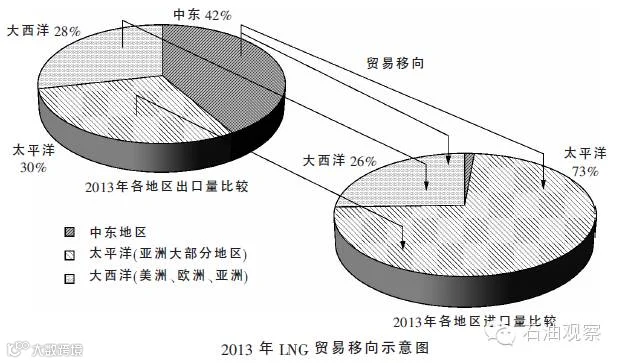 因为需求和供应的区域性变化,导致全球贸易移向也有微小变化(见图5)。非洲LNG产量的下降、南美地区的强劲需求,使美洲及非洲的LNG贸易大多保留在大西洋地区。亚洲的需求增长以及亚洲溢价下的高利润,促使以卡塔尔为代表的中东地区将LNG销售中心由欧洲转向亚洲。同时,太平洋地区的澳大利亚、马来西亚、印尼等亚太地区的主要出口国也将亚洲作为主要销售方向。2013年大西洋地区向太平洋地区的贸易量较2012 年有所下降。