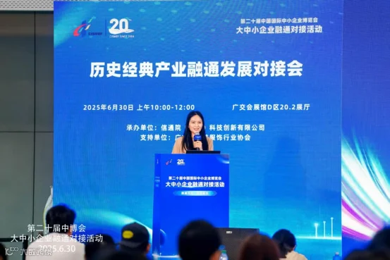 2025年6月30日,第二十届中国国际中小企业博览会大中小企业融通对接活动——历史经典产业融通发展对接会在广交会展馆D区20.2展厅圆满落幕。本次活动由信通院(广东)科技创新有限公司承办,广东省服装服饰行业协会作为支持单位。活动邀请广东省服装服饰行业协会、广东领英科技有限公司、广州盖特软件有限公司,广州钛动科技股份有限公司、永赢金融租赁有限公司等企业代表同台分享发展经验。