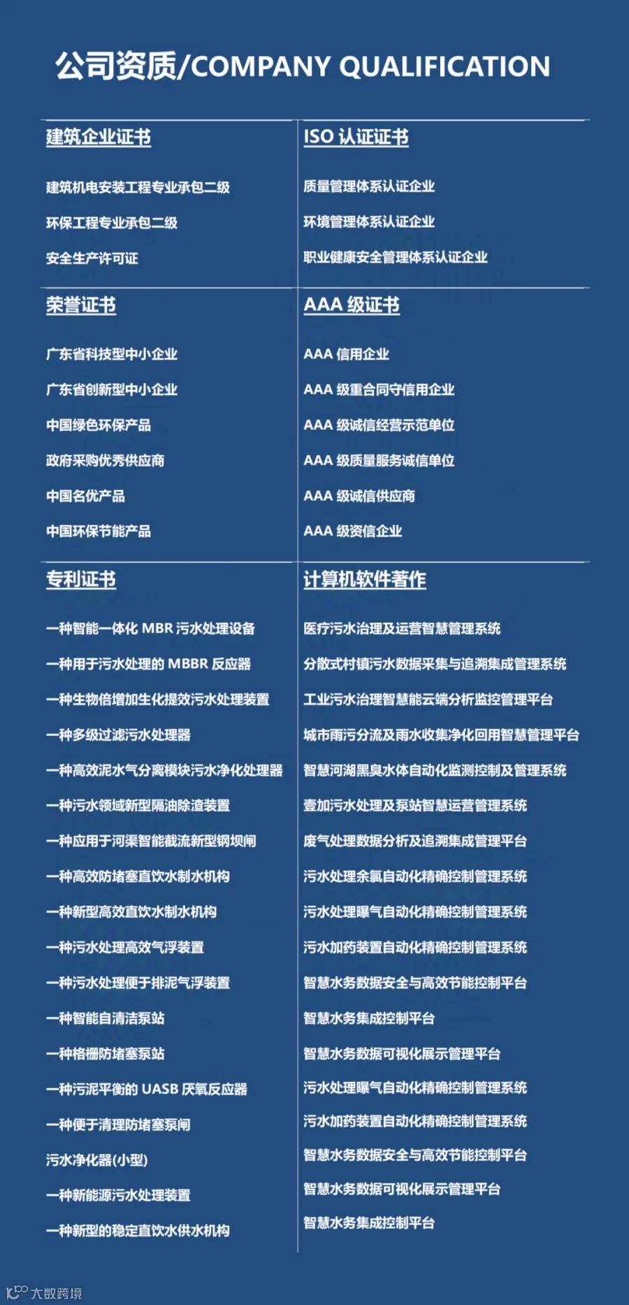 企业现有“环保工程专业承包二级,建筑机电安装工程专业承包二级.安全生产许可证”等资质;自主知识产权30余项、完善的技术团队与产品研发体系,与国内多家环保院校、科研院所开展产学科研合作。