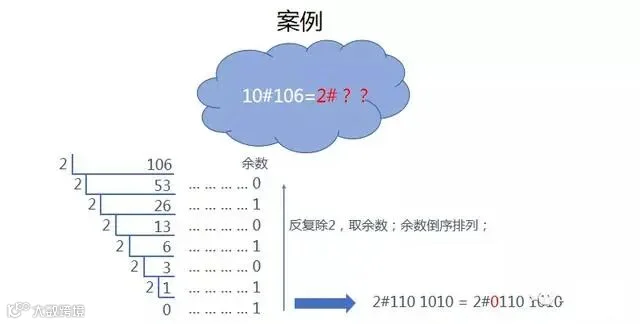 方法:十进制数除2取余法,即十进制数除2,余数为权位上的数,得到的商值继续除2,依此步骤继续向下运算直到商为0为止。