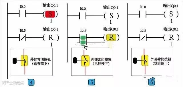 4,外部常闭按钮没有按下时I0.5没有接通,Q0.1复位线圈就没有输出。