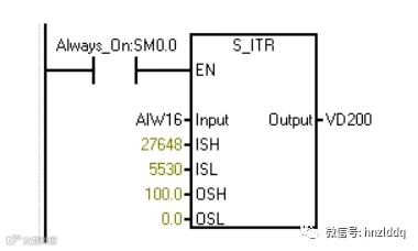 在这个指令库中,子程序S_ITR用来进行模拟量输入到S7-200 SMART 内部数据的转换;子程序S_RTI可用于内部数据到模拟量输出的转换。