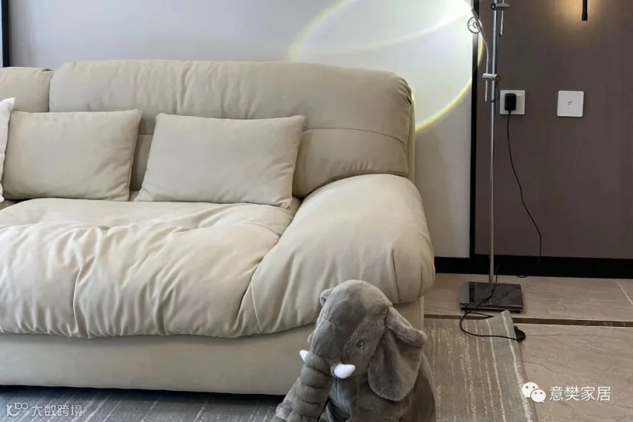 软装上的选择也注重着简约,奶油白的沙发加上无茶几的设计,与空间组合巧妙呼应。一盏氛围日落灯,填补着空间的空白,更显温馨