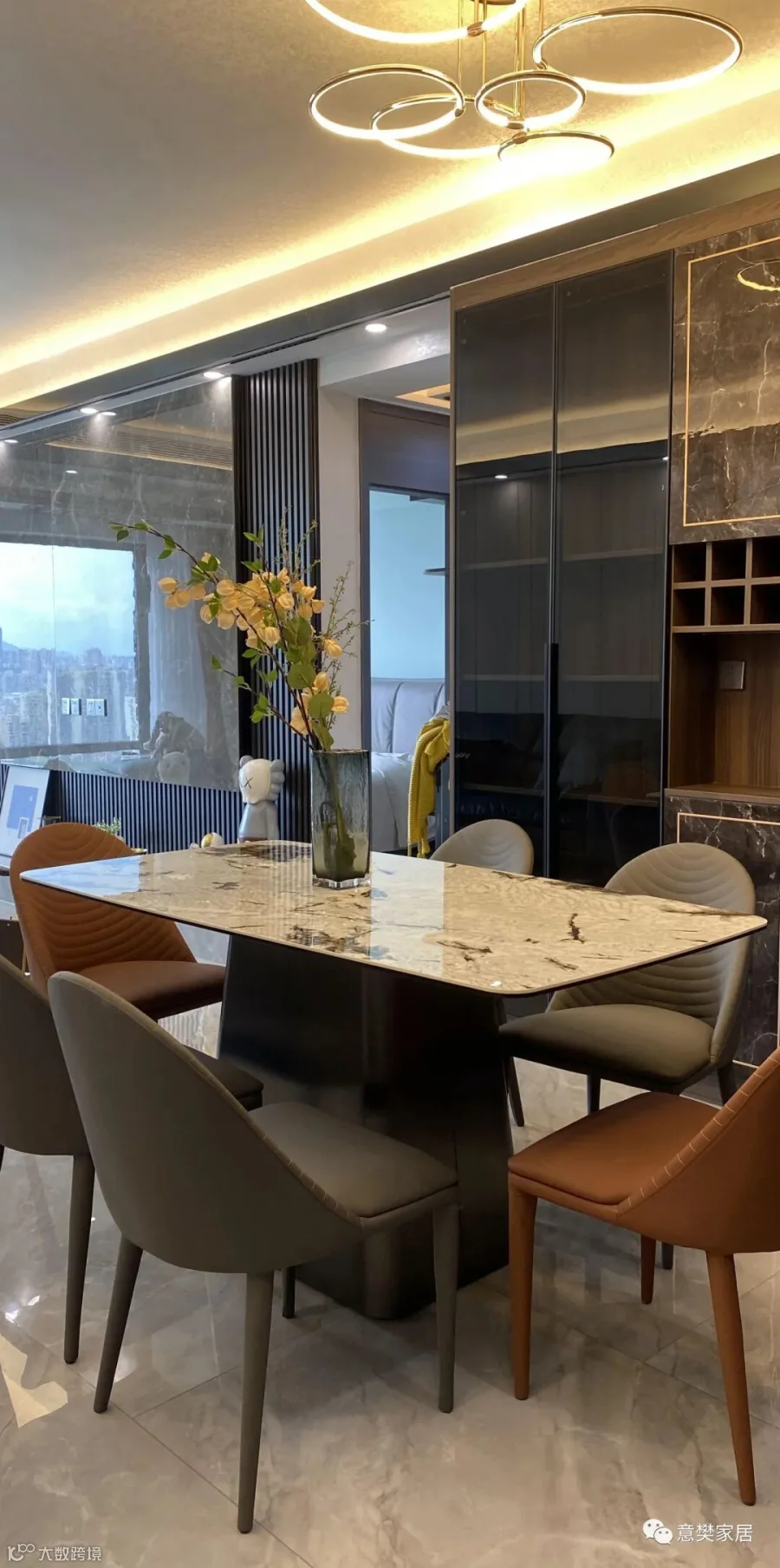 亮光的岩板桌面通过饰品的点缀,打造满满生活气。咖色系与灰色系的餐椅选择,也与空间内的轻奢岩板元素彼此呼应。
