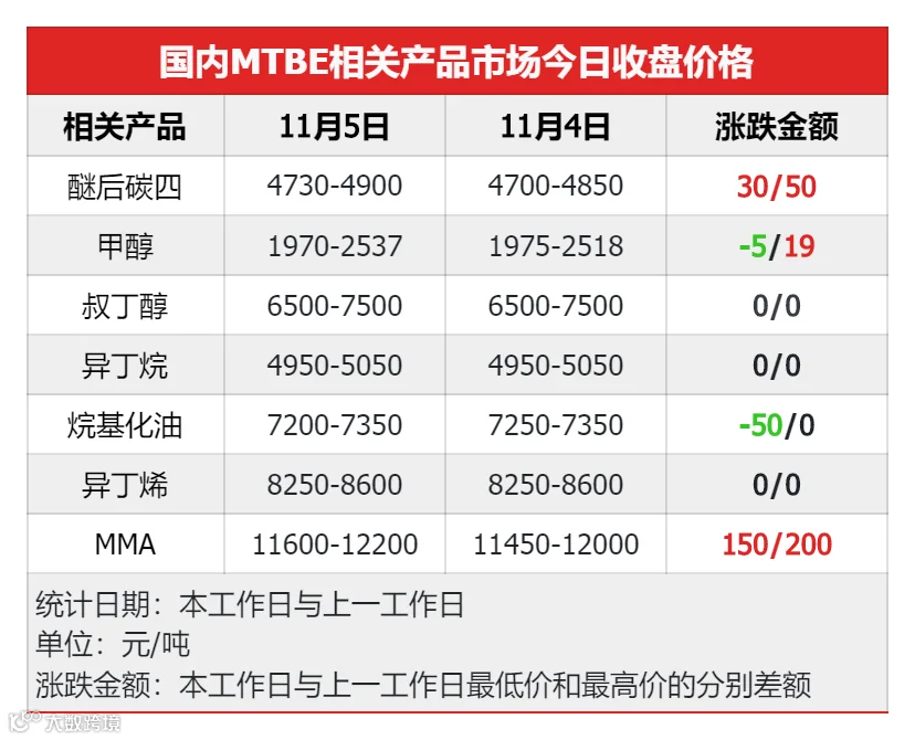 其他产品:叔丁醇、异丁烷、异丁烯行情持稳,MMA行情上涨。
