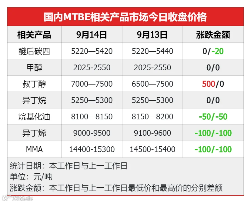 其他产品:叔丁醇上涨,MMA、异丁烯行情均有下跌,异丁烷持稳。