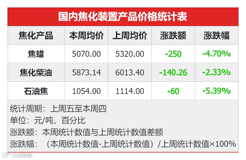 本周期,焦化柴油均价5873.4元/吨,环比跌2.33%。石油焦周均价1054元/吨,环比跌5.39%;焦化蜡油均价5070元/吨,环比跌4.7%。