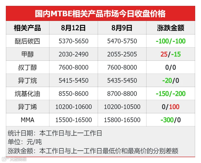 其他产品:叔丁醇行情企稳,异丁烷、MMA行情下跌,异丁烯行情小幅上涨。