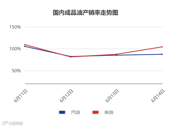 本周期,山东地炼汽油周均产销率96%,柴油周均产销率97%,环比情况为汽涨柴跌,均未达产销平衡。具体来看,汽油方面,端午节后,部分终端集中补货,交投氛围良好;但随着补货结束,加上零售限价下调,终端采购积极性欠佳;因此炼厂汽油产销率上涨,但未达产销平衡;柴油方面,由于高温天气增多,户外工程类行业陆续停工,加上南方连续阴雨天气,抑制柴油终端需求,且市场信心不足,贸易投机操作谨慎,新单成交显著下滑。