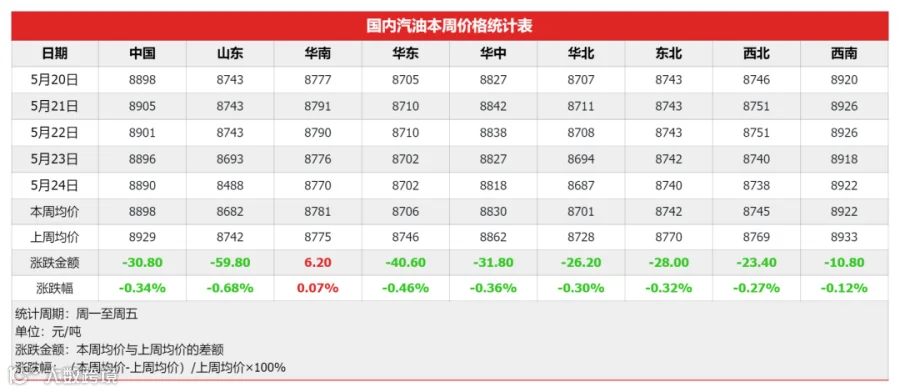 因上周五原油价格走涨,提振国内市场心态,加上前期炼厂利润倒挂,多积极推涨,在买涨心态刺激下,业者采购积极性较高,汽柴船单成交增多,市场成交明显好转,但汽油刚需暂无利好提振,涨幅相对受限;随后,原油价格大跳水,连续四个工作日走跌,市场观望情绪加剧,且部分业者阶段性备货收尾,以销定进为主,购销氛围再次转淡,汽柴价格随之走跌。