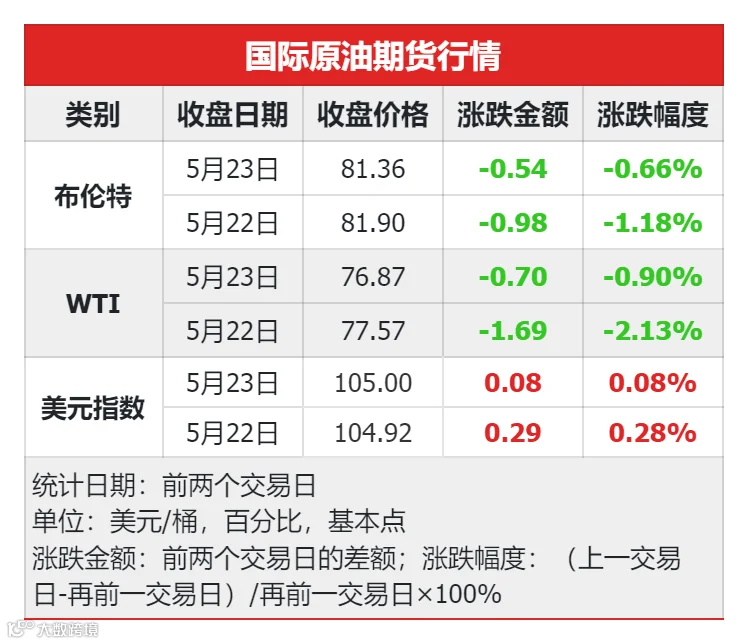 5月23日(周四),WTI跌0.9%,布伦特跌0.66%。