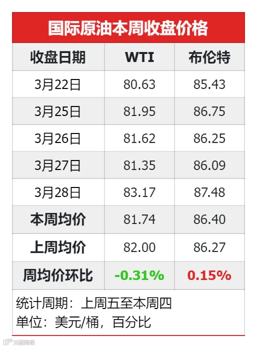 WTI周均价81.74美元/桶,环比下跌0.31%;布伦特周均价86.40美元/桶,环比上涨0.15%。