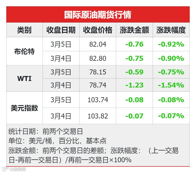 3月5日(周二),国际原油高位偏弱震荡,美油跌0.75%,布油跌0.92%。