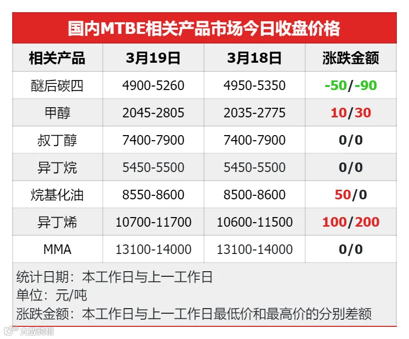 其他产品:叔丁醇、异丁烷、MMA行情维稳,异丁烯行情续涨。