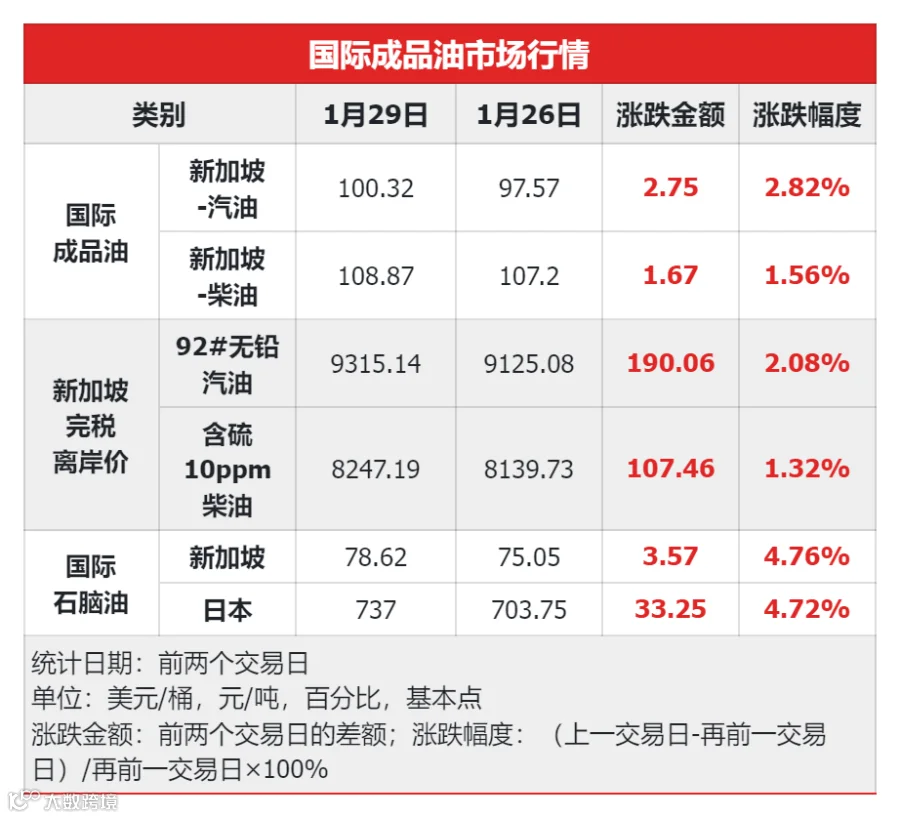 零售调价方面,今天是第九个工作日,参考原油品种的均价为77.80美元/桶,变化率3.67%,对应国内汽柴油零售价应上调190元/吨,本轮调价窗口是2024年1月31日的24点。