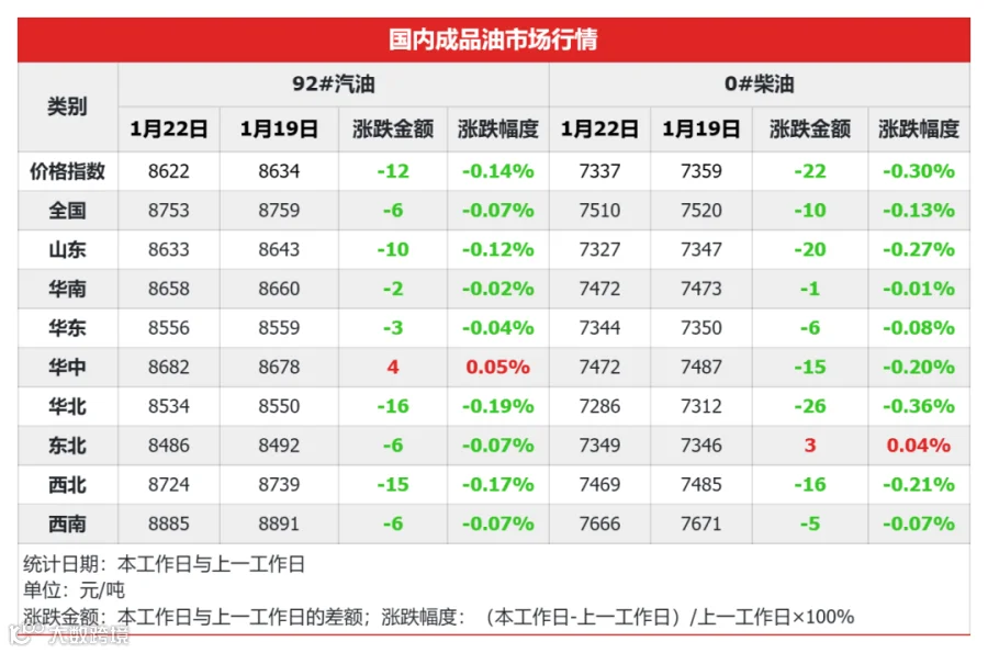 零售调价方面,今天是第四个工作日,参考原油品种的均价为76.36美元/桶,变化率1.76%,对应国内汽柴油零售价应上调90元/吨,本轮调价窗口是2024年1月31日的24点。