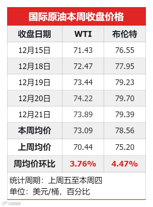 WTI周均价73.09美元/桶,环比上涨3.76%;布伦特周均价78.56美元/桶,环比上涨4.47%。