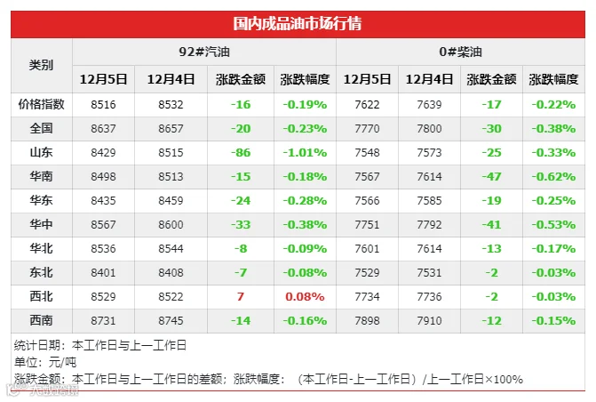 零售调价方面,今天是第一个工作日,参考原油品种的均价为74.76美元/桶,变化率-4.80%,对应国内汽柴油零售价应下调280元/吨,本轮调价窗口是12月19号的24点。