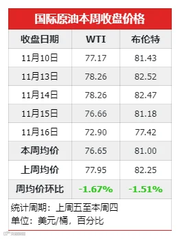 上周五至本周四,国际原油价格呈现先涨后跌走势,周均价环比大跌。