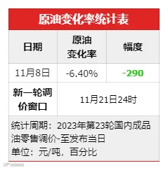 零售调价方面,今天是第一个工作日,参考原油品种的均价为79.49美元/桶,变化率-6.40%,对应国内汽柴油零售价应下调290元/吨,新一轮调价窗口是11月21日的24点。