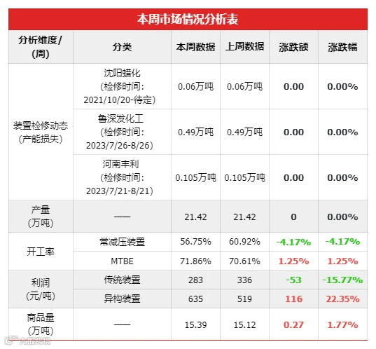 本周期沈阳蜡化、东营齐发、茂名实华等装置停车检修,德宝路装置复工以来继续影响产量增加,下周青州天安或开工,综合之下,预计下周开工率及产量或将继续上涨。