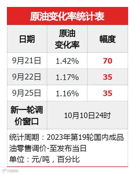 零售调价方面,今天是第二个工作日,参考原油品种的均价为91.69美元/桶,变化率1.17%,对应国内汽柴油零售价应上调35元/吨,新一轮调价窗口是10月10日的24点。