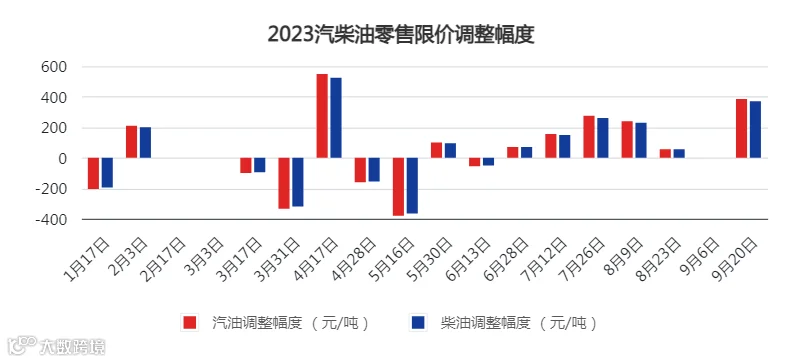自2023年6月28日0时起,国内成品油市场共历经7次调整,其中有6次上调,仅1次搁浅。汽、柴油累计分别上涨1180、1135元/吨。在国际原油价格走势较强的背景下,国内成品油零售限价整体呈现上调偏多状况,成品油零售限价接连上调,这也对国内成品油价格接连上涨形成有效支撑。此外,9月20日24时成品油限价迎来了年内第十次上调,汽柴油上调幅度分别为385元/吨、370元/吨。汽柴油零售限价跟涨0.28元/升-0.32元/升,但批发价格多维持稳定或窄幅上涨,批零价差拉宽,同时,终端加油站理论毛利顺势增加,考虑到销量等因素,加油站优惠幅度有增加空间。