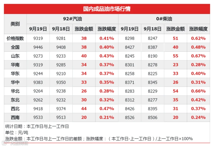 零售调价方面,今天是第十个工作日,参考原油品种的均价为90.30美元/桶,变化率7.88%,对应国内汽柴油零售价分别上调385和370元/吨,新一轮调价窗口是9月20日的24点。