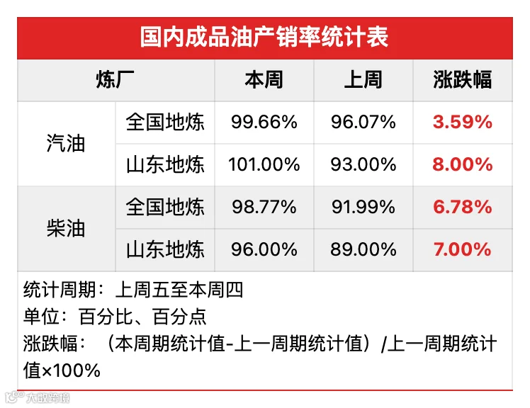 本周期,山东地炼汽油周均产销率101%,柴油周均产销率96%,均较上周有提升。周内受原油持续上行影响,中下游入市积极性有提升,但大单成交不易,柴油船单较少,第三批出口配额落地有提振,周五产销率汽油达120%,柴油达117%。
