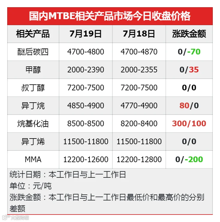今日叔丁醇、异丁烯稳价,甲醇、异丁烷小幅度上调,MMA价格走跌。