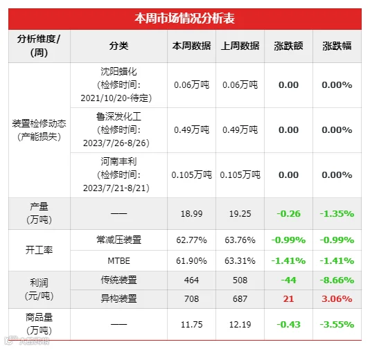 本周期,MTBE周产量在18.99万吨,环比上周下降1.52%;MTBE开工率在61.9%,比上周下跌1.41%。