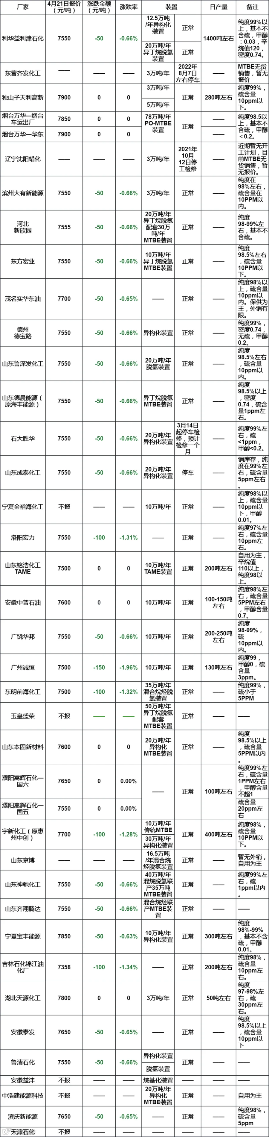 导读:国内MTBE各厂报价(4月21日)