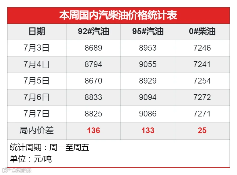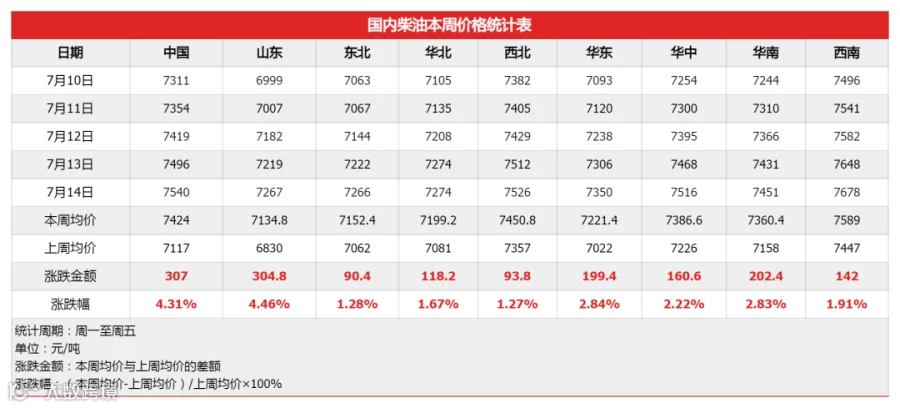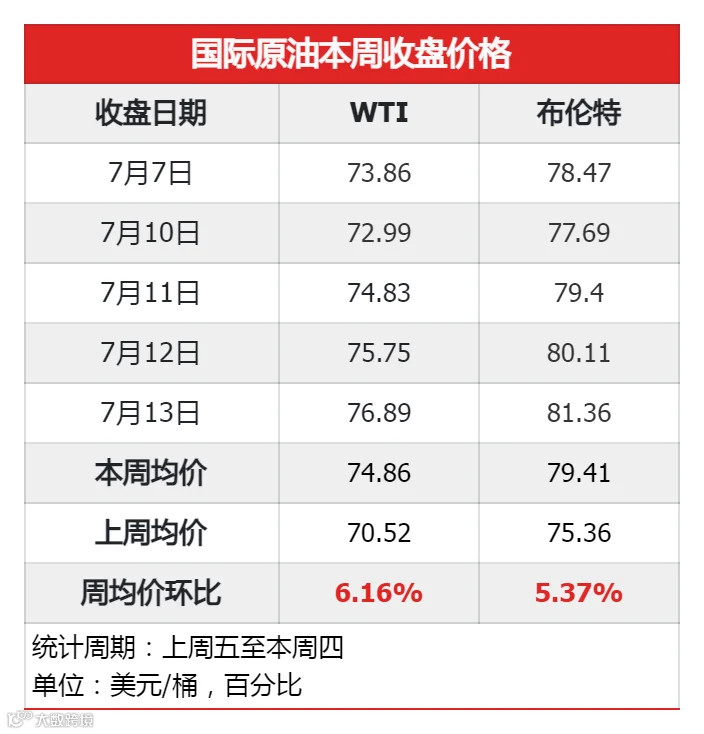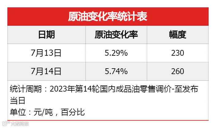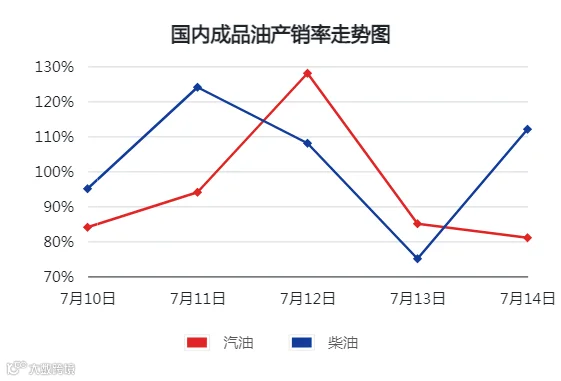截至7月14日,为本轮的第二个工作日,参考原油品种均价78.53美元/桶,变化率为5.74%,对应国内汽柴零售价应上调260元/吨。结合对下周国际原油走势的预判,变化率正向宽幅开端,新一轮调价窗口于7月26日24点开启,预计大概率上调零售价。