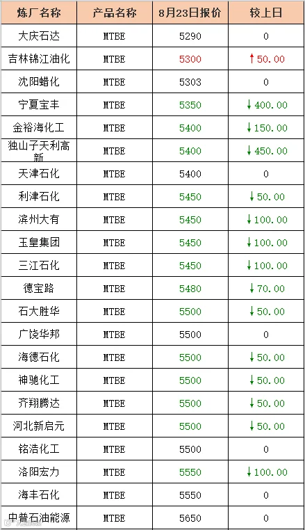 吉牛2021年8月23日地方炼厂,两大集团,异辛烷,MTBE报价