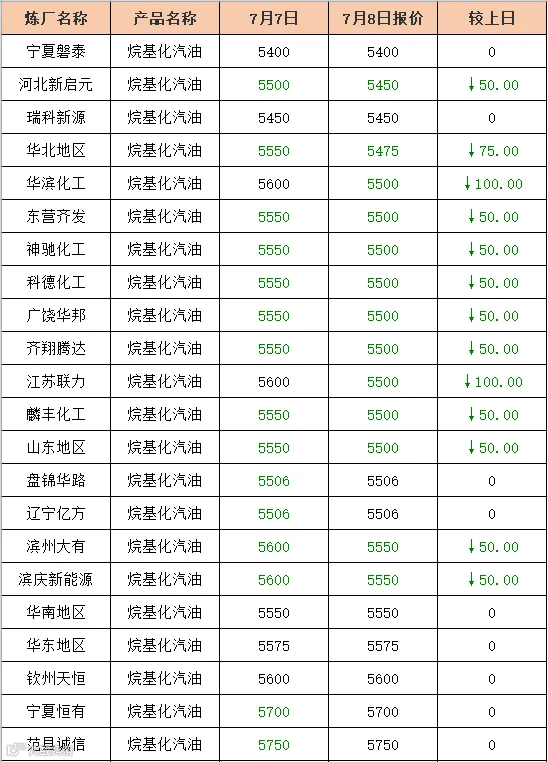 吉牛7月8日炼厂汽油报价