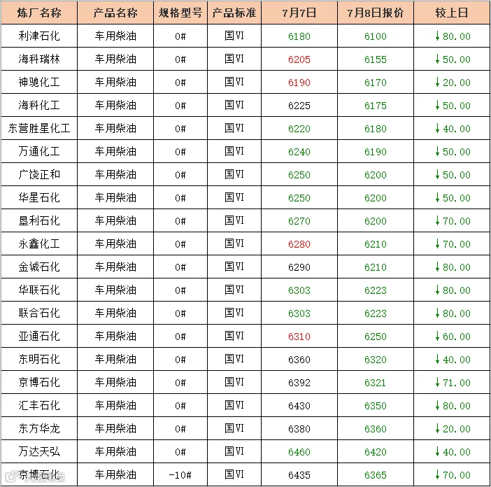 吉牛7月8日炼厂柴油报价