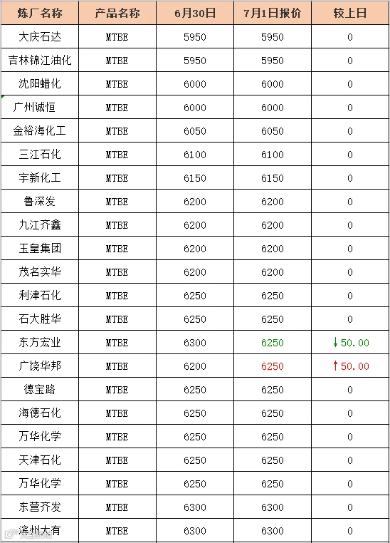 吉牛2021年7月1日地方炼厂,两大集团,异辛烷,MTBE报价