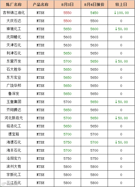 吉牛2021年8月4日地方炼厂,两大集团,异辛烷,MTBE报价