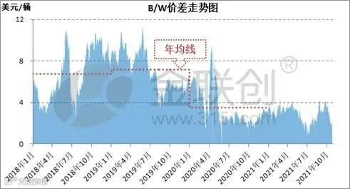 【金点评】在经历了2020年上半年疫情的无情打压后,国际原油市场自2020年下半年开始逐步恢复,在恢复的过程,Brent和WTI之间的价格差却在不断缩水。截至2021年10月26日,B/W的价差仅为1.75美元/桶,为今年7月中以来的最低值(见下图)。